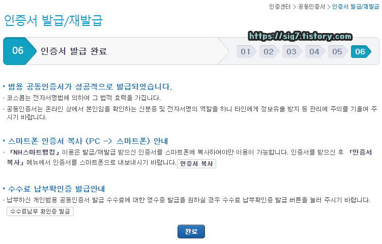저장 위치 및 인증서 암호 설정을 끝내면 범용 인증서 발급이 완료됩니다. 여기서 완료 버튼을 눌러주거나 창을 닫아주면 됩니다.