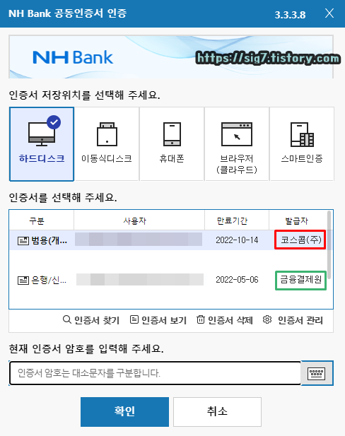 위 사진을 보시면 아시겠지만 범용인증서(개인)와 공동인증서(은행/신용카드/보험)는 따로 구분하여 사용할 수 있습니다.