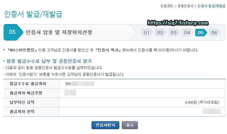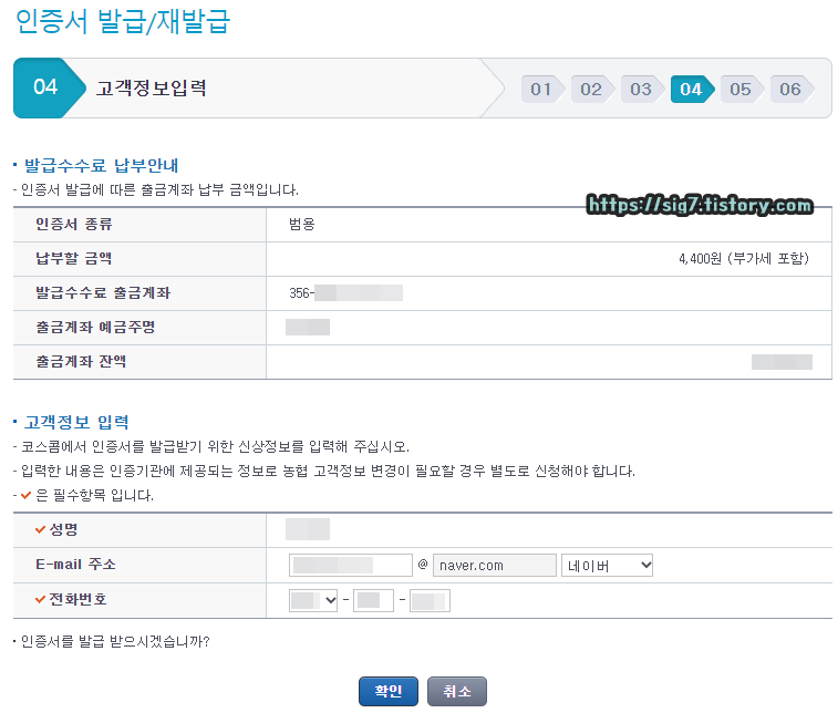 범용 인증서 발급 수수료 4,400원이 출금될 계좌를 확인한 후, 아래에 보이는 확인 버튼을 눌러줍니다.