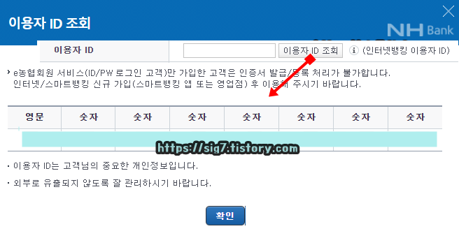 이용자 ID(인터넷 뱅킹 이용 아이디)와 주민등록번호를 입력해줍니다. 그리고 인증서 구분을 '범용인증서'로 선택한 후, 아래에 보이는 확인 버튼을 눌러줍니다.