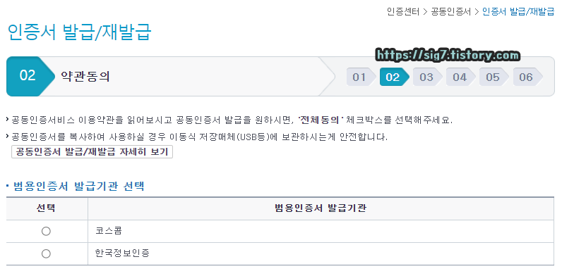 범용인증서 발급 기관을 선택해줍니다. 선택 가능한 발급 기관은 코스콤과 한국정보인증입니다.