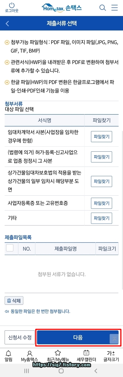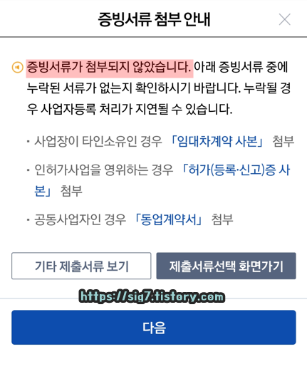 그럼 이렇게 "증빙서류가 첨부되지 않았습니다."라는 메시지가 뜨는데요. 저와 같은 케이스라면 위 메시지는 무시하고 아래에 보이는 다음 버튼만 눌러주면 됩니다.