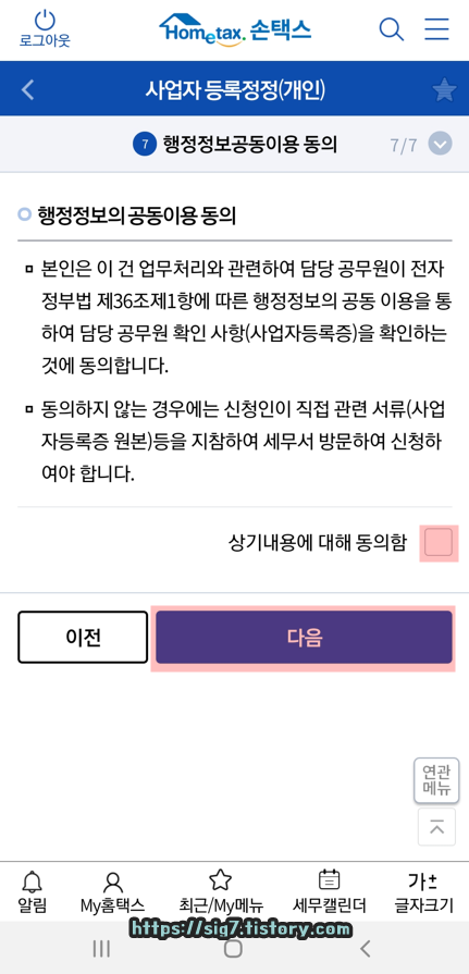 상기내용에 대해 동의함을 체크한 후, 다음 버튼을 눌러줍니다.