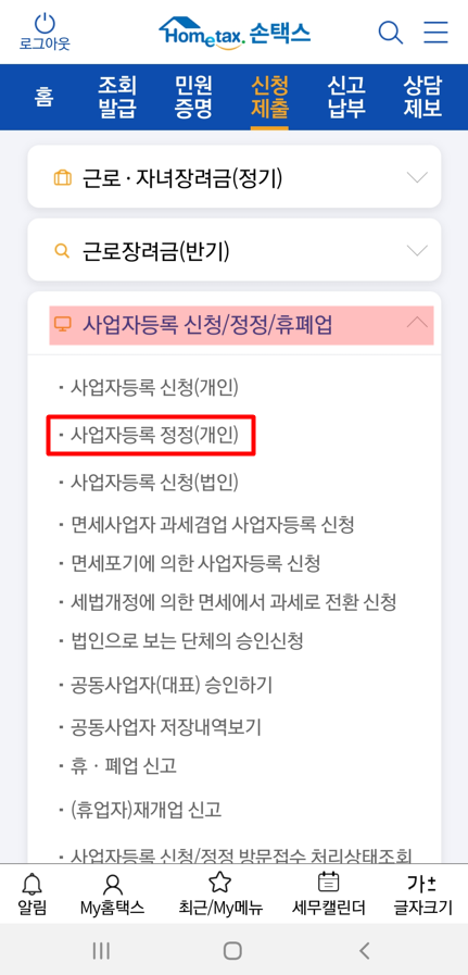 로그인 후, 신청 및 제출 > 사업자등록 신청/정정/휴폐업 > '사업자등록 정정(개인)'을 눌러줍니다.