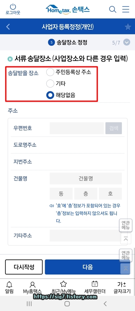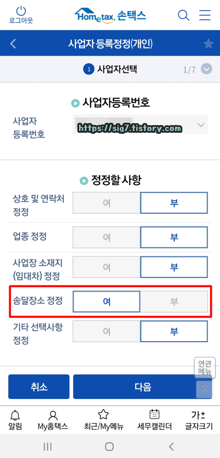사업자 등록번호 선택 후, 정정할 사항을 체크해줍니다. 저는 이사 및 전입 신고로 인해 주소지만 변경되었기 때문에 '송달장소 정정'에서 '여'를 선택했습니다. 정정할 사항 선택이 끝났다면, 아래에 보이는 다음 버튼을 눌러줍니다.