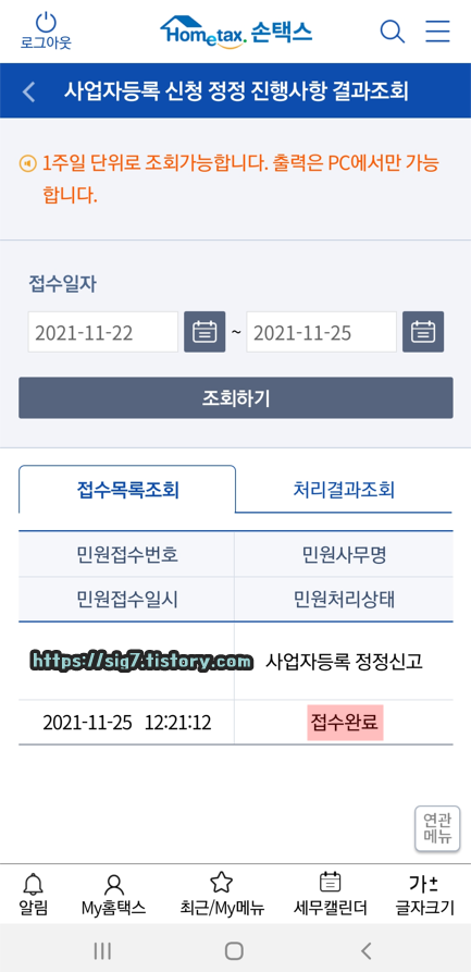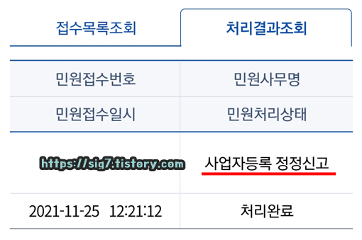개인사업자 정정 신청서 제출을 끝으로 접수가 완료되었습니다. 이제 처리가 완료될 때까지 기다리는 일만 남았네요. 개인사업자 주소 변경 처리는 평일 기준으로 빠르면 당일, 늦으면 다음날 완료됩니다.