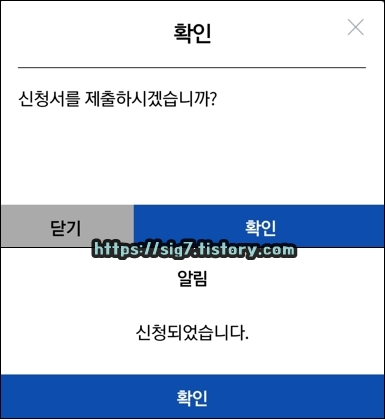 그러면 위와 같이 "신청서를 제출하시겠습니까?" 안내 창이 뜨는데요. 여기서 '확인'을 눌러줍니다.