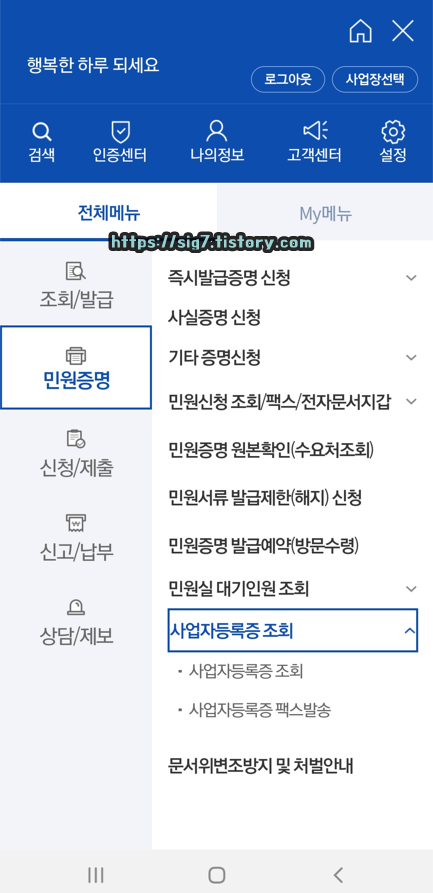 여기서 민원증명 메뉴에 있는 '사업자등록증 조회'로 가면 개인사업자 주소 정정 완료된 사업자 등록증 열람이 가능합니다.