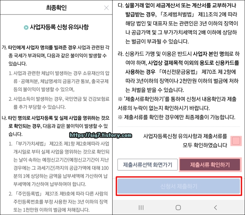 마지막으로 개인사업자 주소 정정 신청 전 '최종 확인 단계'입니다. 아래에 보이는 "사업자등록신청 유의사항과 제출서류를 모두 확인하였습니다."를 체크한 후, '제출서류 확인하기'를 눌러줍니다. 그리고 이어서 '신청서 제출하기'를 눌러줍니다.