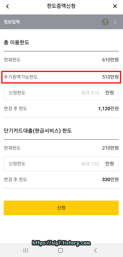 추가 증액 신청 한도를 입력해줍니다. 저 같은 경우에는 추가 증액을 510만 원까지 할 수 있네요.