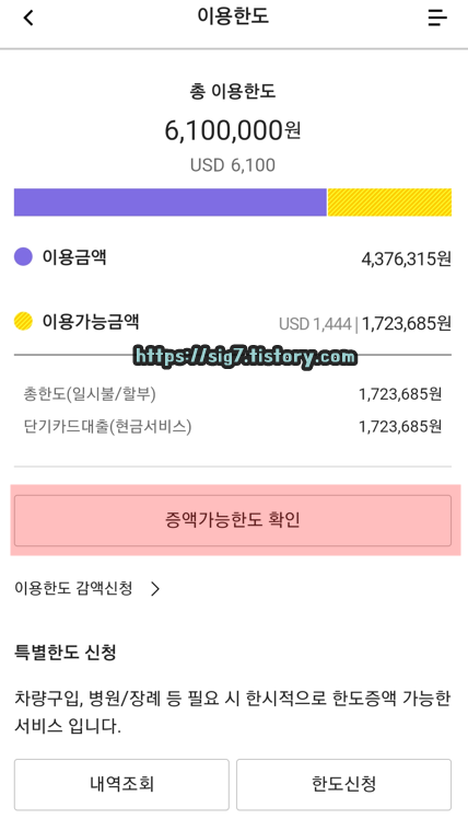 여기서 '증액가능한도 확인'을 눌러줍니다.
