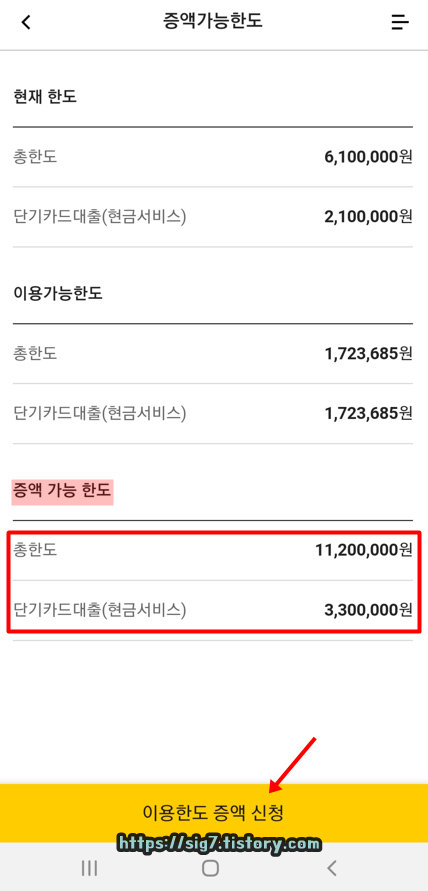 위와 같이 증액 가능 한도가 나온다면, 아래에 보이는 '이용한도 증액 신청'을 눌러줍니다.