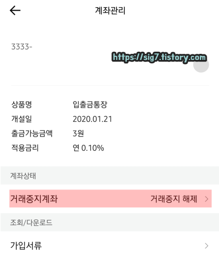 계좌 상태에 있는 '거래중지 해제'를 눌러줍니다.