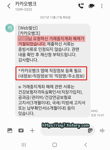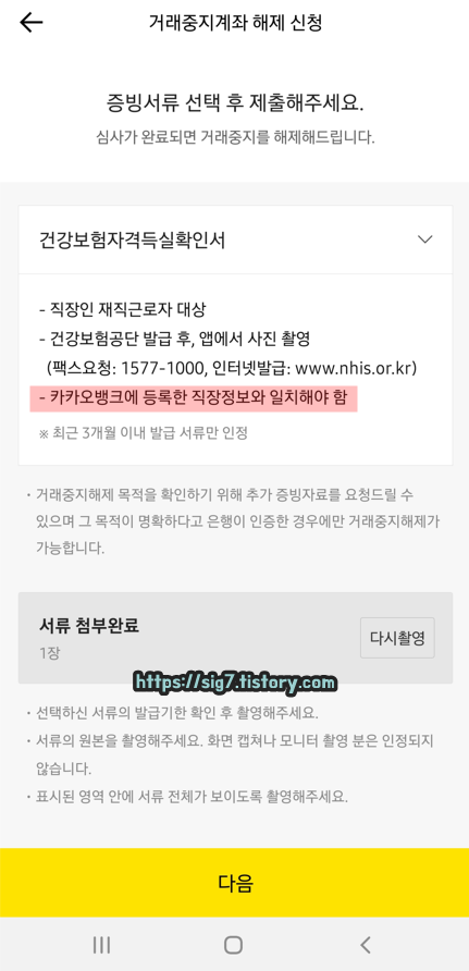 그런데 만약 내가 제출한 증빙 서류에 문제가 있거나 증빙 서류에 적힌 정보와 카카오뱅크 앱 내에 등록된 정보가 다를 경우 거래중지 계좌 해제가 거절됩니다.