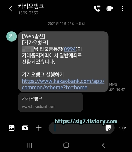 실제로 장기간 거래가 없어 '거래 중지 계좌'로 전환될 경우에는 카카오뱅크에서 이렇게 안내 문자를 보내줍니다.