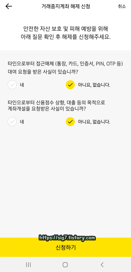 다행스럽게도 카카오뱅크 거래 중지 계좌는 '증빙 서류만 있으면' 모바일에서도 간단히 해제할 수 있습니다.