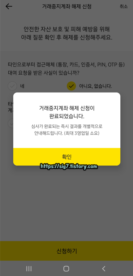 그러면 이렇게 거래 중지 계좌 해제 신청이 완료됩니다. 이제 심사가 완료될 때까지 기다리는 일만 남았습니다. 심사 결과 안내는 최대 3영업일까지 걸릴 수 있다고 하네요. (보통 다음 영업일에 처리됨)