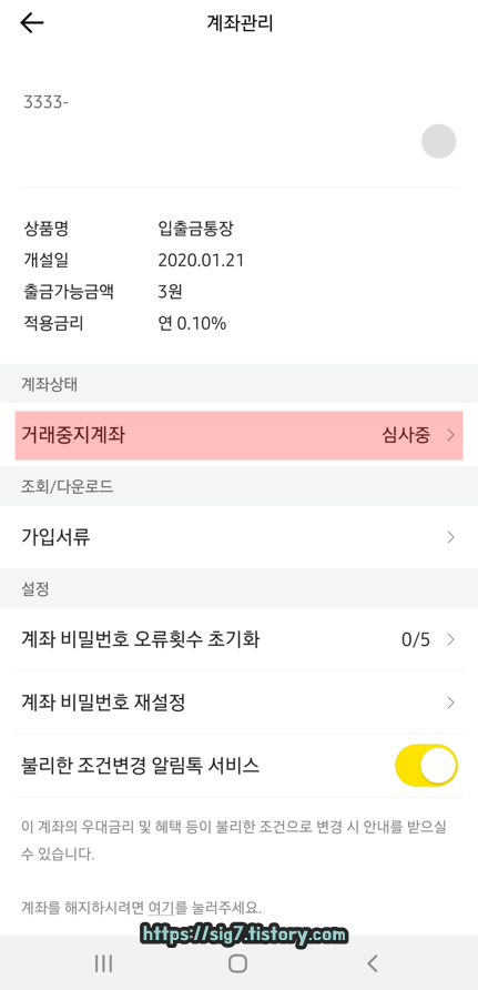 거래 중지 계좌로 전환될 경우에는 입출금 거래, 체크카드 결제, 대출금 약정 등이 제한됩니다.