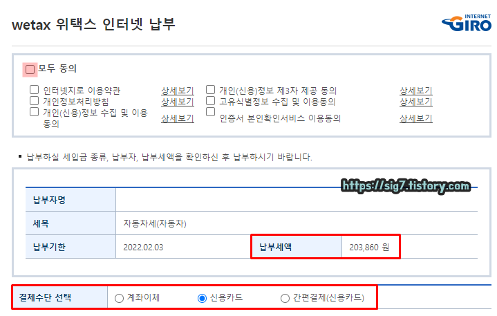 이용약관 '모두 동의'를 체크한 후, 납부세액을 확인해줍니다. 그리고 이어서 결제 수단을 선택해줍니다. 선택 가능한 결제 수단은 계좌이체, 신용카드, 간편결제(페이코, 네이버페이 등)입니다.