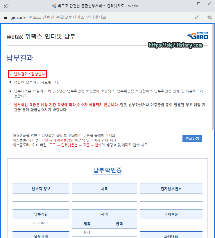 결제 정보를 제대로 입력했다면 이렇게 "납부결과 : 정상납부"라고 표시될 것입니다. 이렇게 뜬다면 자동차세 연납 신청 및 납부가 완료된 것입니다.