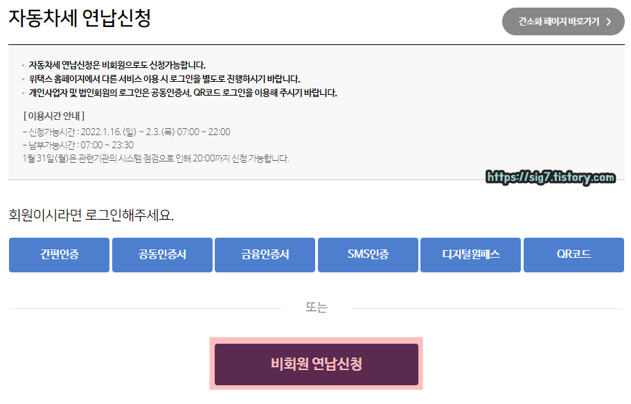 자동차세 연납 신청은 굳이 로그인할 필요는 없기 때문에. 아래에 보이는 '비회원 연납신청'을 눌러줍니다.