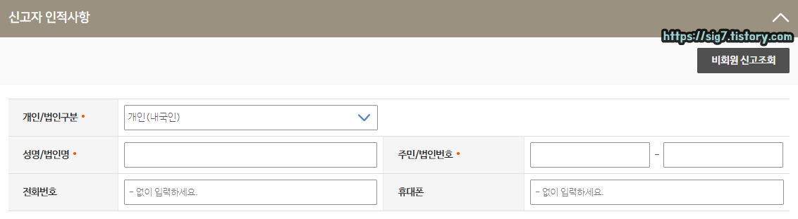 개인/법인 구분, 성명, 주민등록번호, 전화번호 또는 휴대폰번호(택1)를 입력해줍니다.