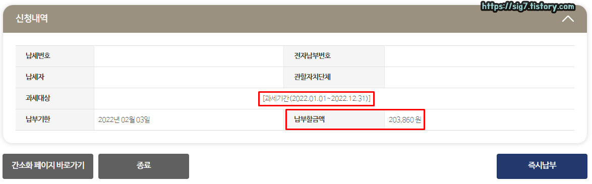 과세기간과 납부할 금액을 확인한 후, '즉시납부'를 눌러줍니다. 참고로 여기 나오는 '납부할금액'은 연납 할인(9.15%)이 적용된 금액입니다.
