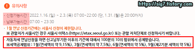 자동차세 1월 연납 신청은 22년 01월 16일 일요일부터 22년 02월 03일 목요일까지 가능하며, 신청 가능 시간은 07시부터 22시까지입니다. (01월 31일 월요일은 20시까지만 가능)