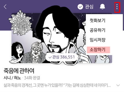우측 상단에 점이 3개 찍힌 것(전체 메뉴)을 누른 후, '소장하기'를 눌러줍니다.
