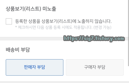 상품보기 리스트 미노출 옵션과 배송비 부담 정보를 입력해줍니다.