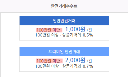 결제 수수료 다음으로 나가는 것은 바로 '안전거래 수수료'이다. 일반 안전거래 기준으로 판매 대금이 100만원 미만이라면 1건당 1,000원이고, 100만원 이상이라면 상품 가격의 0.5%이다. 그리고 프리미엄 안전거래는 100만원 미만 건당 2,000원이며, 100만원 이상 상품 가격은 0.7%이다.