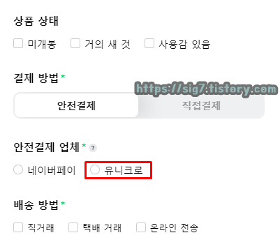 네이버카페에 상품 등록 게시판이 있다면, 판매글을 쓸 때 안전결제 업체(네이버페이, 유니크로)를 선택해서 올릴 수 있다.