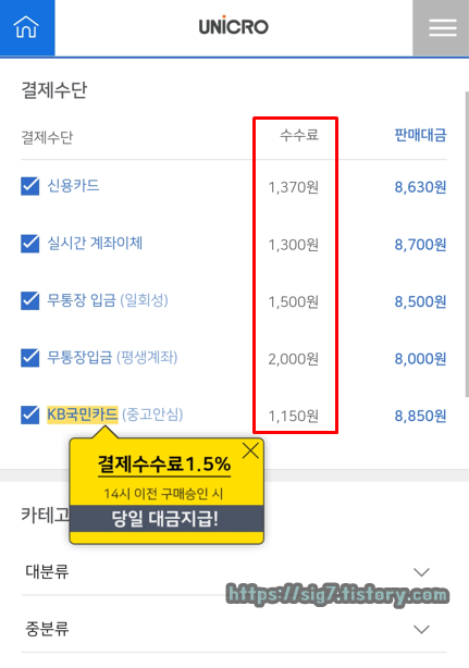 1. 결제 수수료 1.5% (일반 신용카드 결제 시 3.7%)