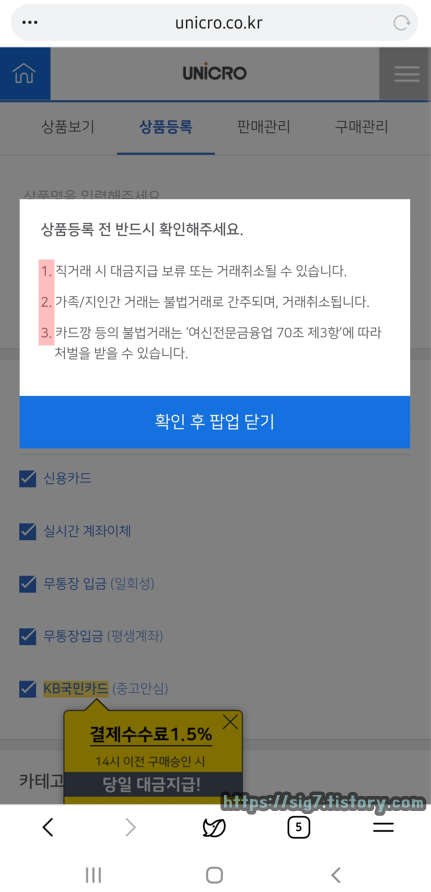 유니크로 안전거래는 유니크로 사이트에서만 이용할 수 있는 것은 아니다. 네이버 카페 '상품등록게시판'을 통한 거래에도 이용할 수 있다. 이것은 제휴 사이트라 그런 것인데. 여기서 우리가 주목해야 할 것은 유니크로에서 했을 때와 네이버 카페에서 했을 때 '결제 수수료가 서로 다르다는 것'이다.