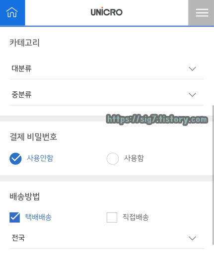 카테고리, 결제 비밀번호(구매자 결제 시 입력하게 되는 암호), 배송 방법을 선택해줍니다.