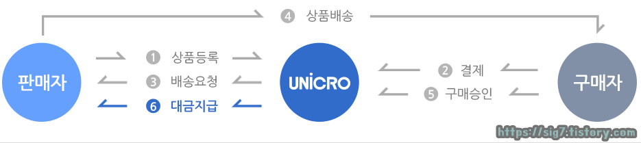 유니크로의 거래 프로세스는 이러하다. 일반적인 쇼핑몰에서 물건을 팔거나 구매하는 것을 떠올리면 이해가 더욱 빠를 것이다.