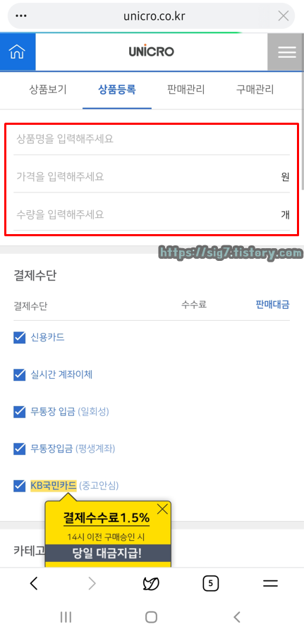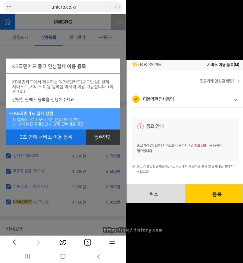 만약 'KB국민카드'를 결제 가능 수단으로 설정했다면, KB국민카드 중고 안심결제 이용 등록을 해줘야 합니다.