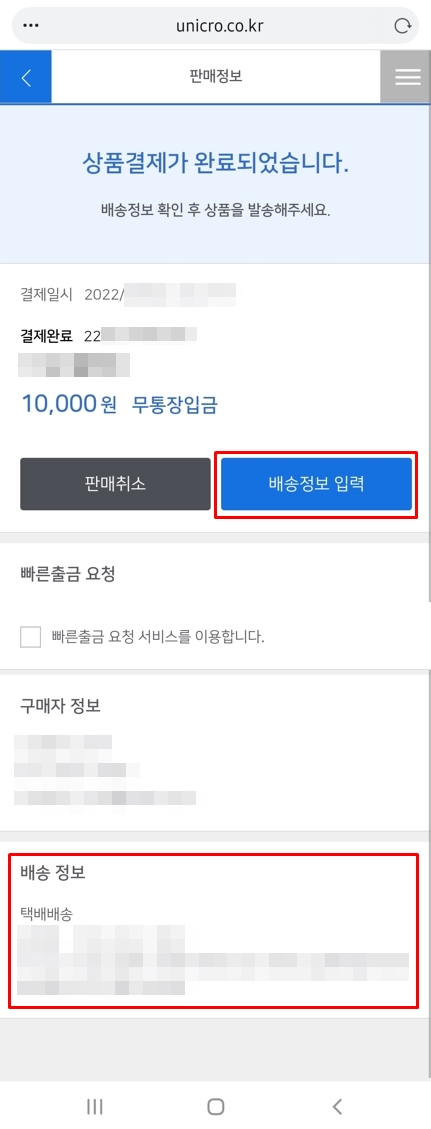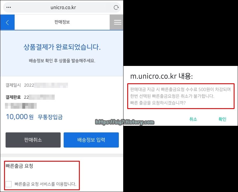 참고로 '빠른 출금 요청'은 500원 지불 시 판매 대금을 지급일보다 하루빨리 받을 수 있게 해주는 서비스입니다.