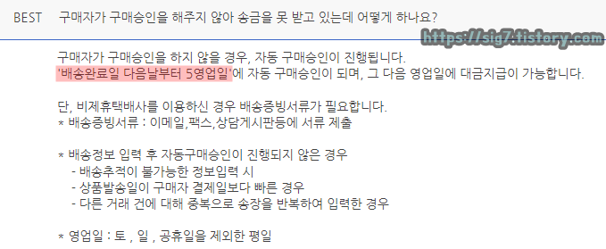 그런데 만약 구매자가 물건을 받고도 구매 승인 버튼을 계속해서 누르지 않는다면, 돈을 평생 못 받는 것일까? 그것은 아니다. 구매자가 물건을 받고도 구매 승인 버튼을 누르지 않았을 경우에는 '배송 완료일 다음날부터 5 영업일이 되는 날' 자동으로 구매 승인 처리가 되며, 그다음 영업일에 판매 대금을 지급받을 수 있게 된다.