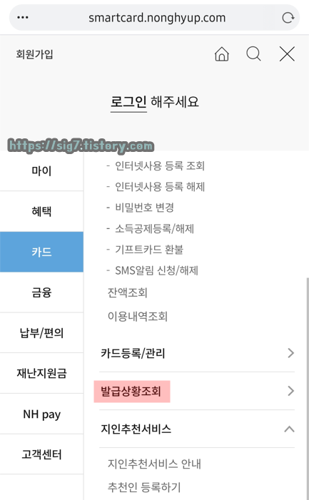 이어서 '카드 메뉴'에 있는 '발급상황조회'를 눌러줍니다.