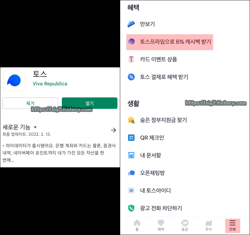 토스 프라임 해지 및 환불 방법에 대해서도 한 번 알아볼까요? 먼저 토스 앱을 실행시킨 후, '전체 메뉴'에 있는 '토스프라임으로 6% 캐시백 받기'를 눌러줍니다.