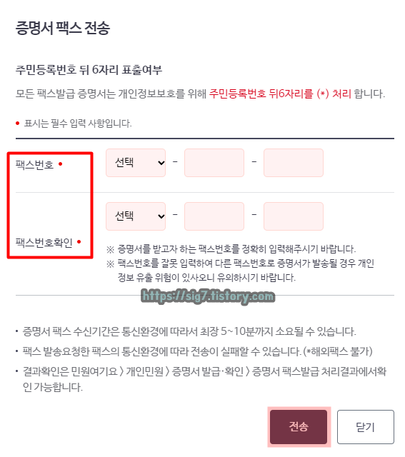 보낼 곳의 팩스 번호를 입력해줍니다. 팩스번호와 팩스번호 확인 모두 입력해야 합니다. 모두 입력해줬다면, 우측 하단에 보이는 전송을 눌러줍니다.