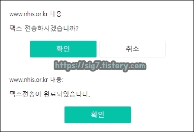 여기서 '확인'을 눌러주면, 건강보험득실확인서 팩스 발송 신청 끝입니다.