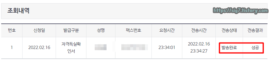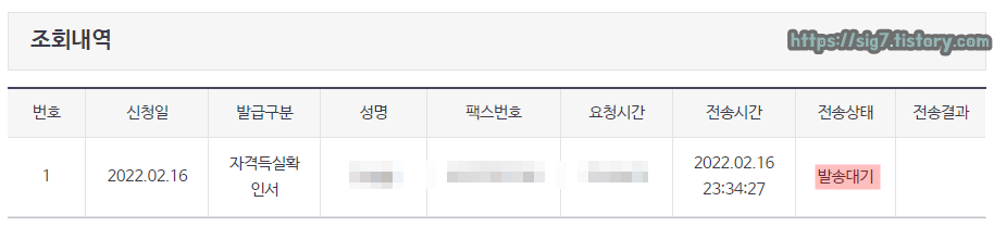 팩스 전송 신청 직후, 발급 처리 결과를 확인한 모습입니다. 아직은 전송 상태가 '발송대기'이네요.