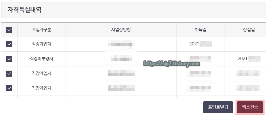 ※ '직장근로자'라면 가입자 구분이 '직장가입자'이면서 취득일이 살아있는 것만 체크해서 전송하면 됩니다. (모든 이력 전부 체크해서 보낼 필요는 없음)
