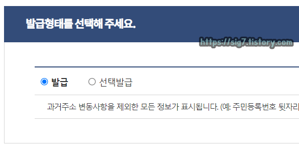 발급 형태를 선택해줍니다. 발급은 해당 문서에 표시할 수 있는 모든 정보가 나오는 것이고, 선택 발급은 주민등록 뒷자리를 가리거나, 세대 구성원의 일부 정보를 표시하지 않거나 할 수 있습니다.