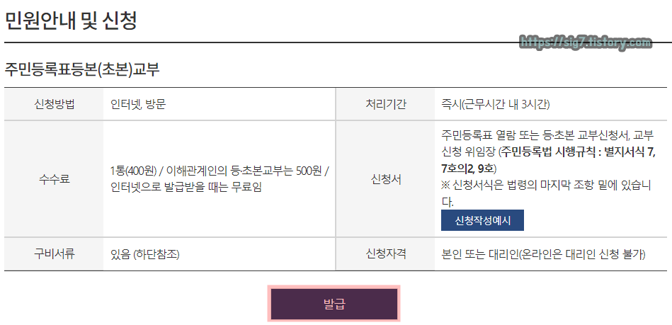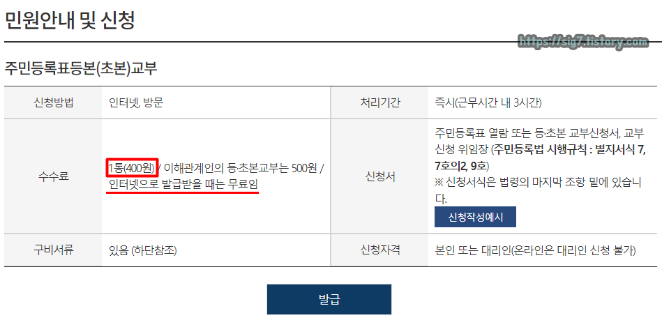 ※ 오프라인(주민센터, 무인발급기)에서 발급받을 경우 주민등록등본 1통당 400원의 수수료를 지불해야 합니다.