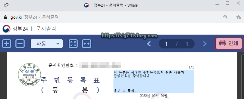 위와 같이 문서 출력 창이 뜨면, 우측 상단에 보이는 '인쇄'를 눌러줍니다.