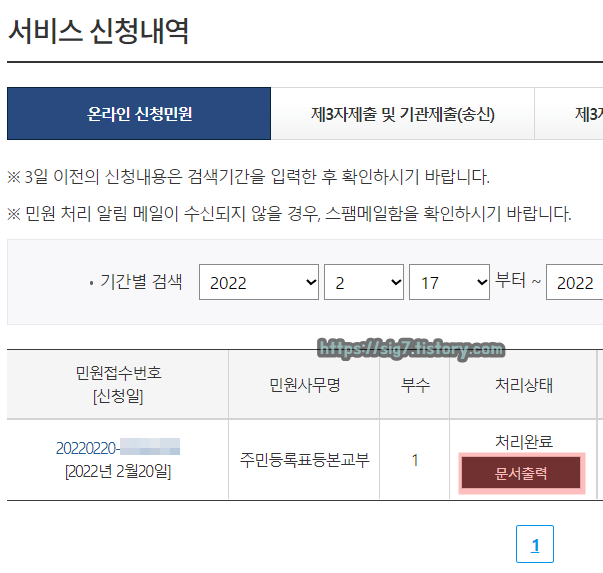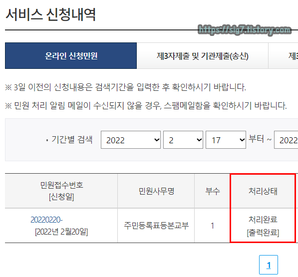 문서 출력을 완료하면 이렇게 처리 상태가 '출력완료'로 변경됩니다. 만약 재발급하길 원한다면 처음부터 다시 신청해줘야 합니다.
