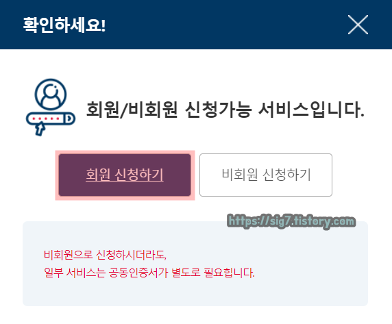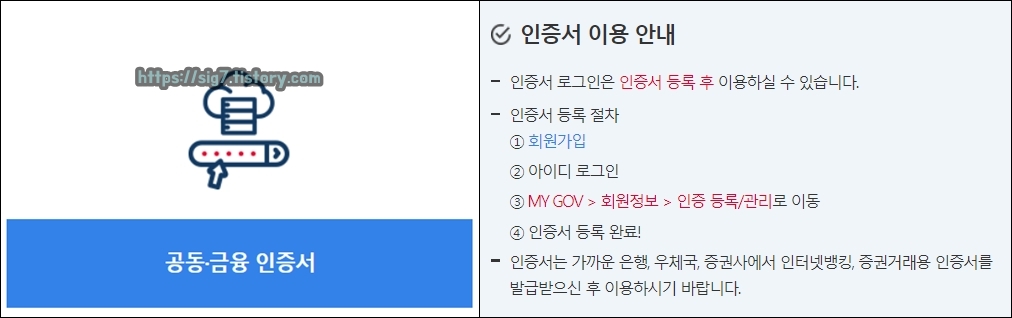 만약 공동 인증서 또는 금융 인증서 로그인을 원한다면, 정부24 아이디 회원가입 후 'MY GOV 메뉴'를 통해 인증서를 등록해줘야 합니다.